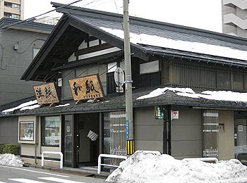 『秋田の町屋・秋田市町屋調査報告書』(五十嵐典彦)によると、「現在、大町に点在する町屋はすべて明治19年以降のものであり、那波伊四郎家は大火直後に土崎の町屋を移築したと伝えられ、主屋の立ち上がりが低く、屋根勾配もゆるいことから江戸後期の形式を色濃く残している」という。 現在、店舗部分が改造されているものの、住居部分は当初の形式がよく残されている。木造一部二階建、切妻造の鉄板葺屋根に庇付きで、屋根は最初、小羽葺 (こばぶき)だったという。家屋は正面庇 と店舗部に改造が加えられているが、通 りの角地にあたるため、店土間が店座敷 の周囲に矩形に取り付いている。小路に 面して大戸口があって通り土間に入る。 家屋の間取りは二列型で店の奥に客間二座敷が並んでいる。通り土間寄付きの座敷は大戸に向かい合い玄関の部屋と呼ばれていた。その北側の座敷は床の間と神棚を備え、客間の奥の土間付きにオエ(居間)がある。この住居部分は現在使用されていない。通り土間を奥に入ると二棟の土蔵がある。この内蔵は長年にわたって保存が難しい紙を守ってきた。昭和58年(1983)の日本海中部地震で壁が崩れ落ちたが、那波家では改修の手を加えている。 伝 統的な建物はその地の風土に合った建て方で生き残ってきたもの。その歴史の重みや風景が現代建築によって崩されてゆくのは残念というしかない。